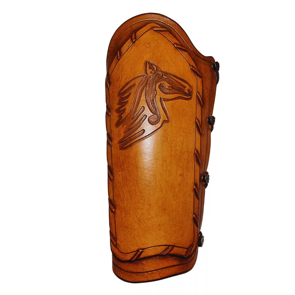 A Váci bőrműves tárgyak jellegzetes rozsdabarna árnyalatában. Vésett mintával van díszítve. Záródása pánt és kapcsok segítségével történik. Bősége szabályozható. Íjászberkekben ki ne találkozott volna már azzal a „nagyszerű” érzéssel, amikor odacsap az ideg az alkarjára. Egy nagyobb erejű íj használata esetén az ideg sebessége a lövés pillanatában akár 150-200km/óra is lehet. Ez bizony, ha rácsap az alkarunkra, nagyon tud fájni. Az ideg-alkar „randevúkért” a tartáshiba a felelős. Erről vagy leszokik az íjász, vagy alkarvédőt vásárol…