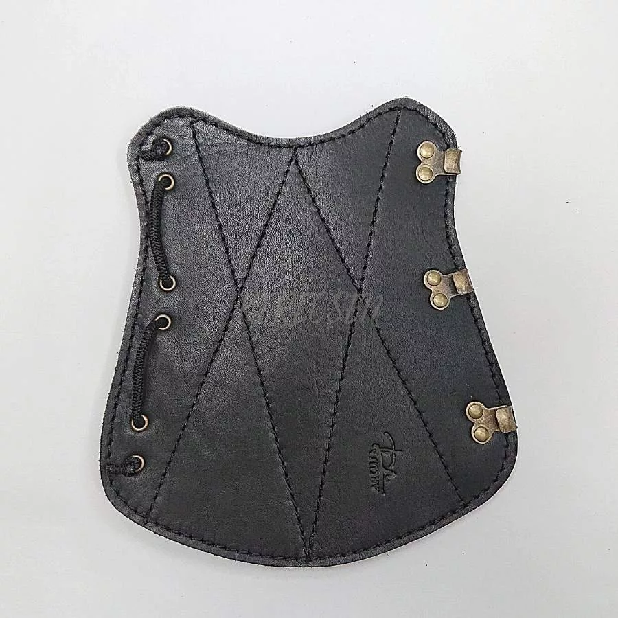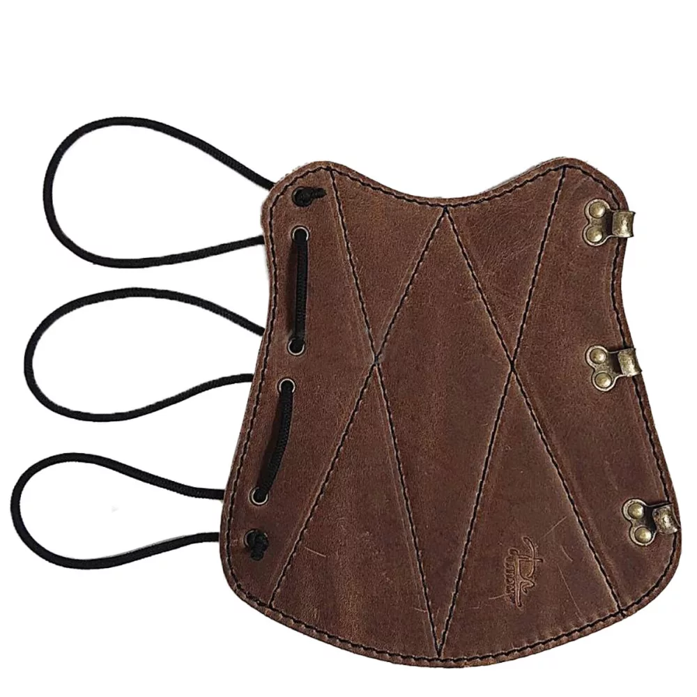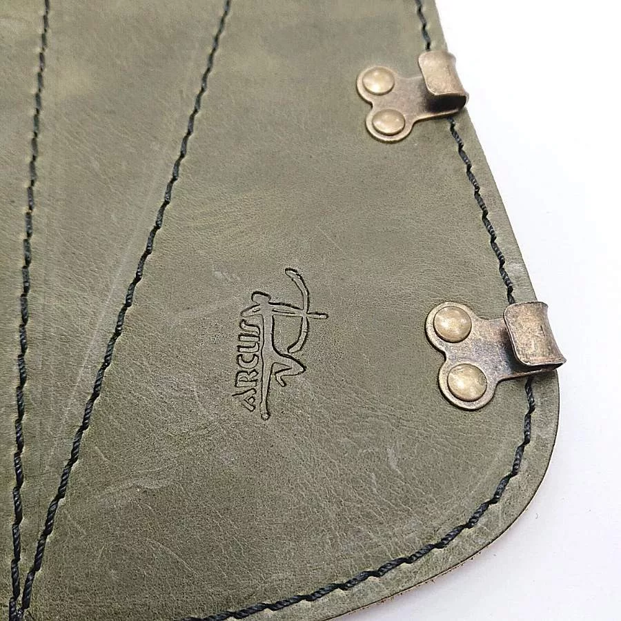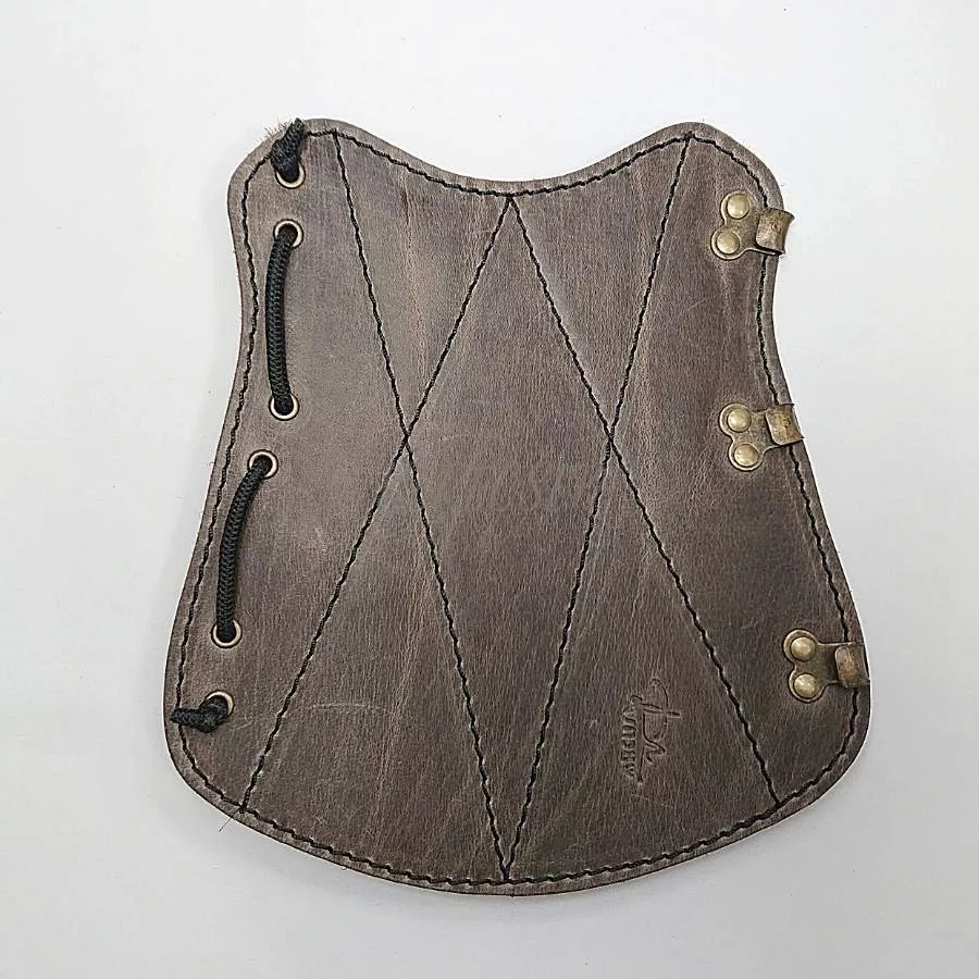 Szemcsézett felszínű, erős bőr kivitel. Steppelt - vagyis rácsozottan varrott mintával van megerősítve. Egyik szélébe gumipánt van fűzve, másik szélén kapcsok vannak elhelyezve. Ezáltal egyszerűen rögzíthető és állítható is méret szerint. Anyaga: marhabőr.