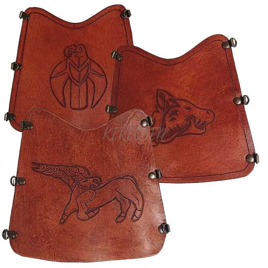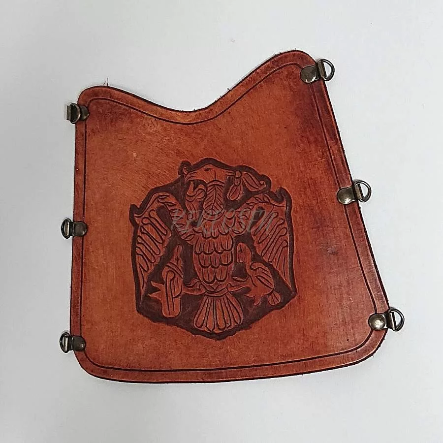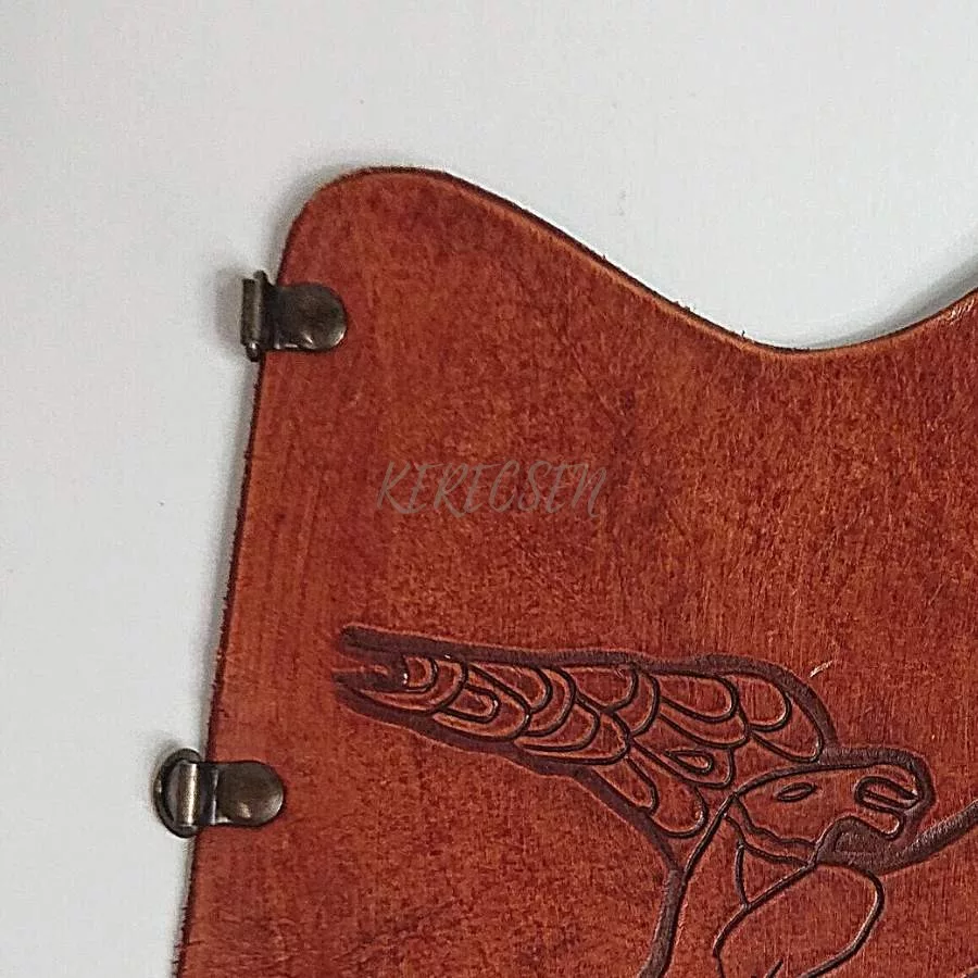 A Váci bőrműves tárgyakra jellemző igényes kivitel. Nagyon szép mintákkal vésett alkarvédő különböző mintákkal. Állítható. kapcsokkal és pánttal rögzíthető.