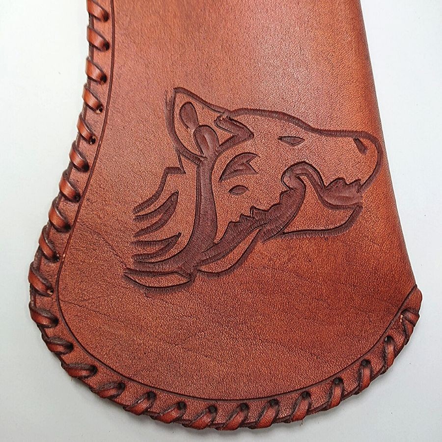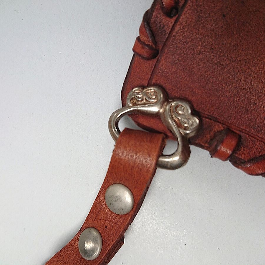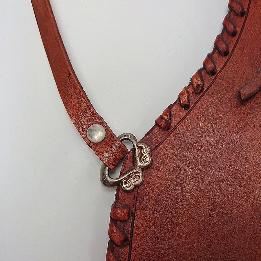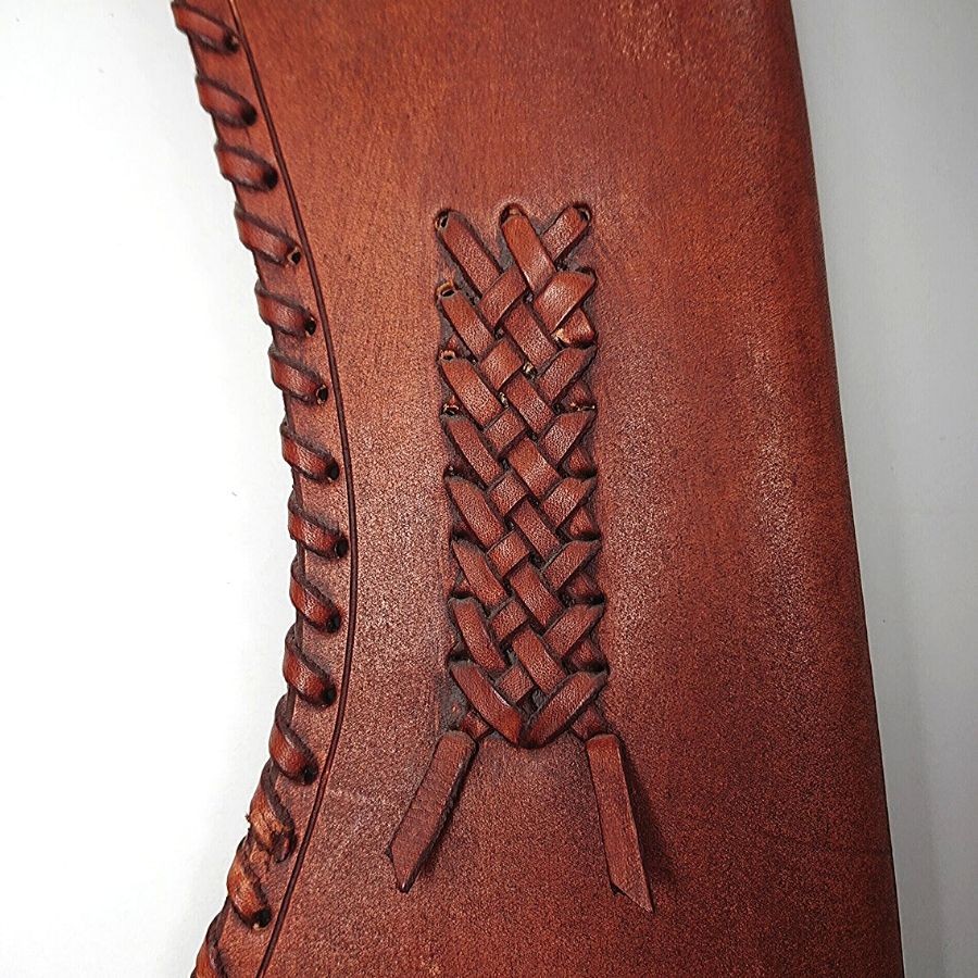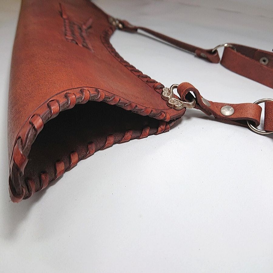 Elegáns rozsdavörös kivitelben, oldalán fűzött és vésett bőr oldaltegez. Bőrszíjai és csatjai segítségével felfűzhető övre. Szélein bőrszalaggal illesztve.